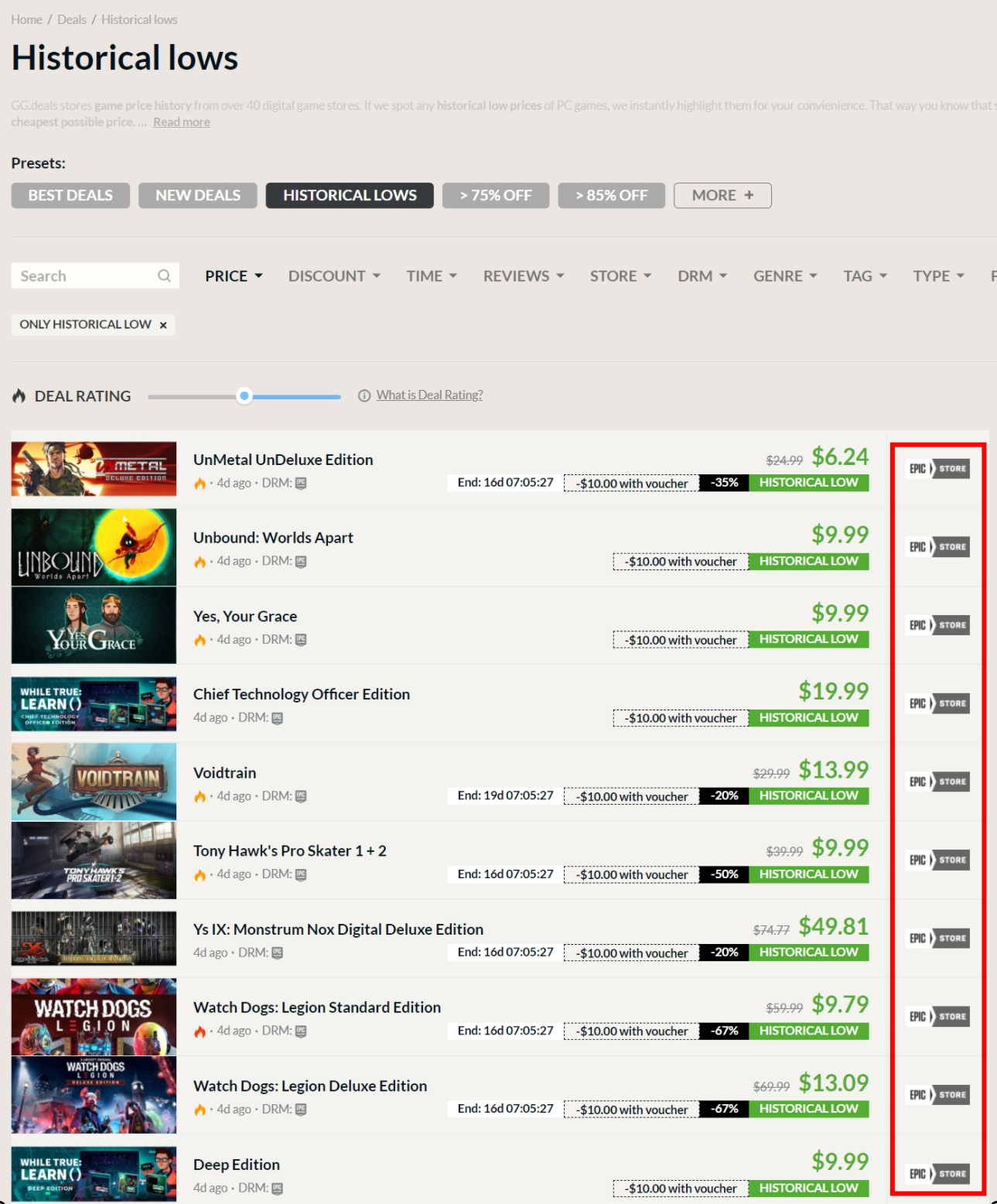 그래서 그런지 gg.deals의 역대 최저가 갱신이 에픽 스토어로 도배가 됐군요.