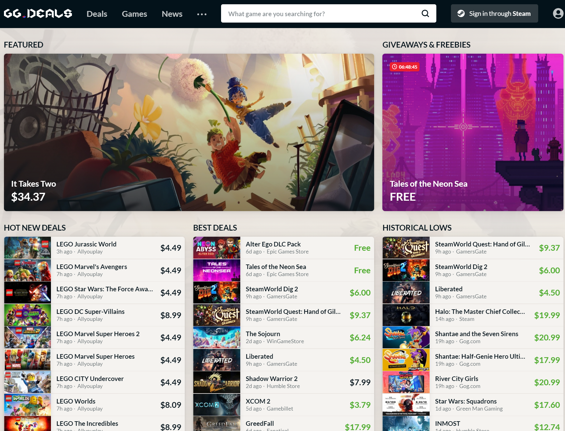 IsThereAnyDeal 사이트에서 사실 딜 검색은 모두 가능하며 강력한 검색 기능을 가지고 있지만 text 위주의 UI라 특별히 검색을 하지 않고 둘러보고 싶을 때는 살짝 아쉬운 감이 있습니다. 그럴 땐 Game deals 사이트가 좋습니다.