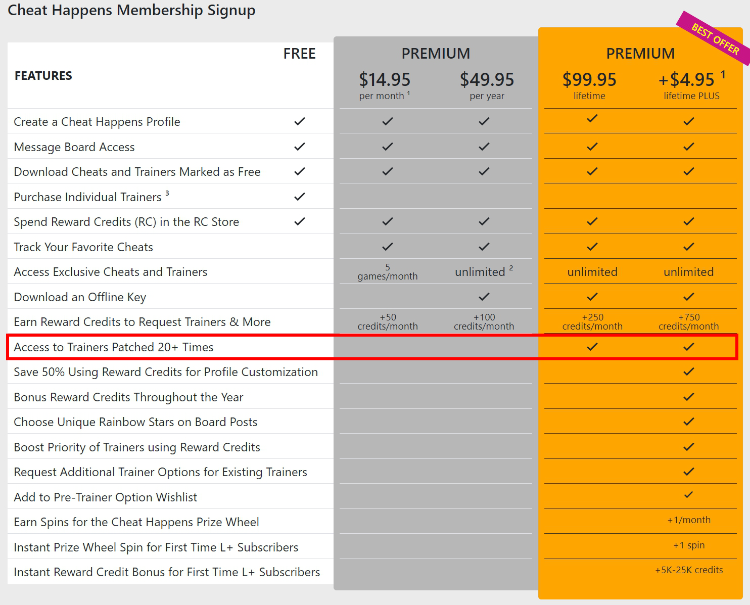 전면 유료화 서비스 입니다. 무료로 얻을 수 있는 서비스가 거의 전무한데다 CheatHappens에서 20번 이상 패치한 트레이너의 경우 월이나 년 구독이 아닌 평생 구독(2021.05 기준 $99.95)을 해야 제공받을 수 있기 때문에 사실 상 평생 구독이 강제됩니다.