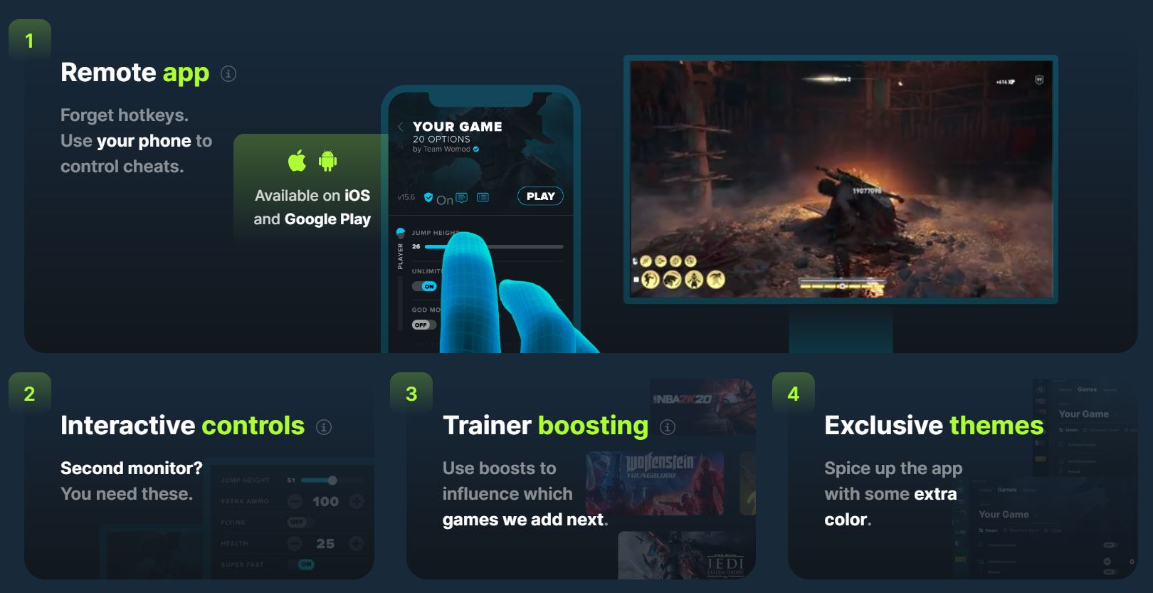 무엇보다 이런 트레이너나 치트들을 제공하는 사이트치고 깔끔한 디자인의 사이트가 눈에 띕니다. 기본적으로 무료이고 유료 결제를 해야 해금되는 기능도 있으나 없어도 불편하지 않는 기능들입니다. 유료 기능은 Pro라는 이름으로 모바일앱으로 트레이너 적용, 트레이너 옵션에 대한 GUI 추가, 트레이너 적용할 게임에 대한 우선 의견 제시 권리, app의 별도 테마를 매월 $5의 구독형으로 제공합니다.