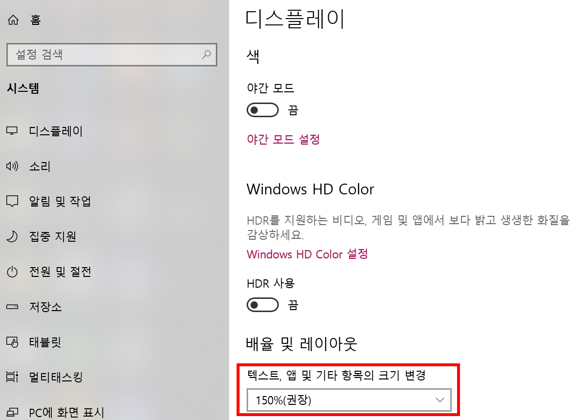 그럴 때는 혹시 내가 4K 모니터 등을 사용하여 윈도우즈 디스플레이의 텍스트 배율이 100%가 아닌 더 높은 비율로 적용이 되어 있는 건 아닌지 확인해봅니다.